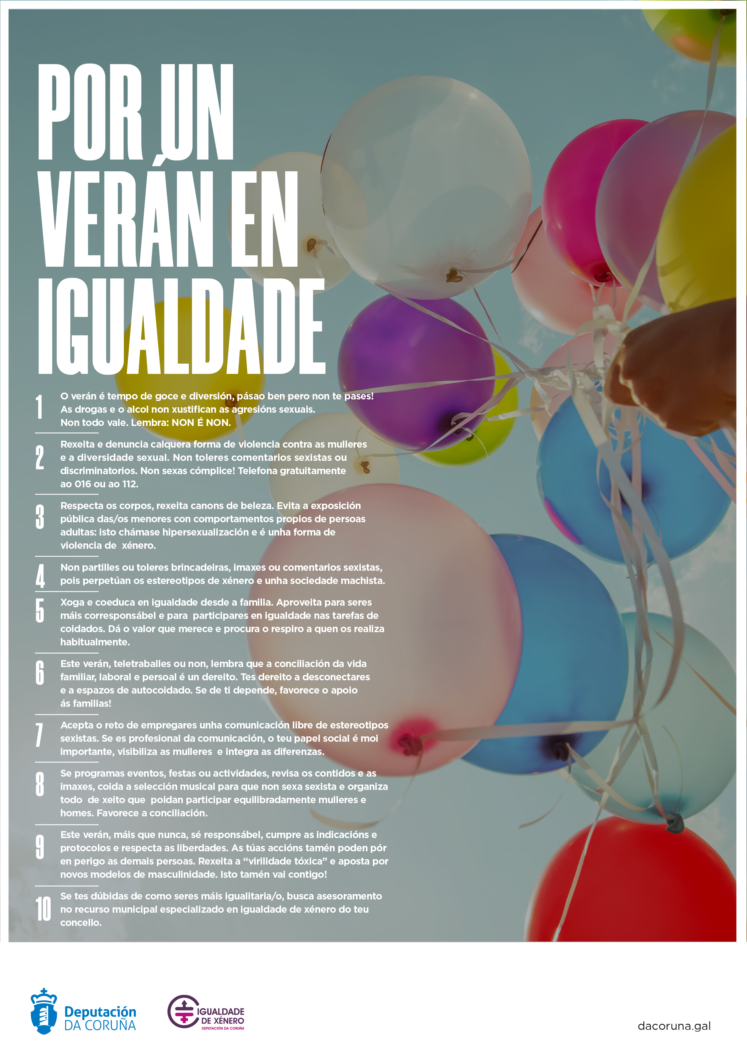 Desde Igualdade da Deputación da Coruña ponse en marcha no marco do seu Plan de Igualdade 2018/2023 (www.compartimosplan.com) unha campaña para promover unhas festas en igualdade, este proxecto comezou no Nadal de 2019, continuo no Entroido 2020 e finaliza co Decálogo por un verán en igualdade.